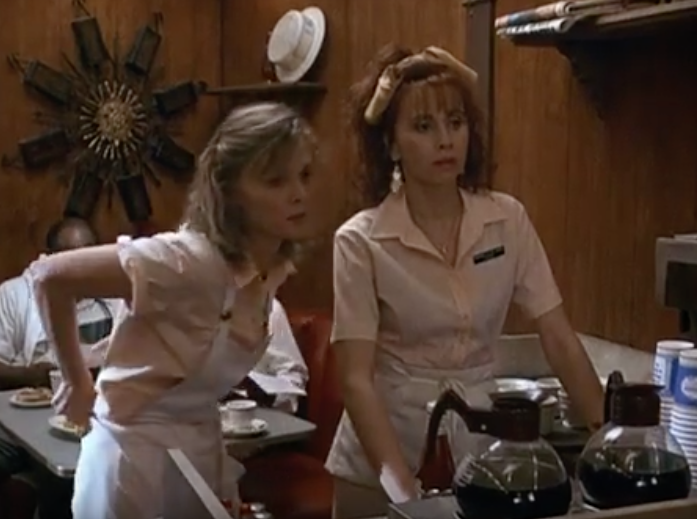 Links zie je een vermoeide Michelle Pfeiffer, rechts haar collega, achter de koffiekannen! Daarmee gaan ze het restaurant rond om mensen koffie bij te schenken.